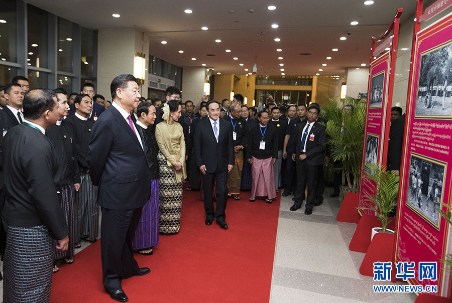 當(dāng)晚,習(xí)近平同緬甸聯(lián)邦議會(huì)議長兼人民院議長蒂昆密和民族院議長曼溫凱丹進(jìn)行了友好交談,并和緬甸主要政黨領(lǐng)導(dǎo)人集體合影留念。