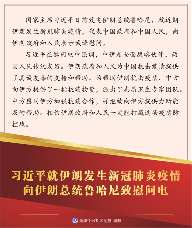 習近平在慰問電中強調(diào),中伊是全面戰(zhàn)略伙伴,兩國人民傳統(tǒng)友好。伊朗政府和人民為中國抗擊疫情提供了真誠友善的支持和幫助。為幫助伊朗抗擊疫情,中方向伊方提供了一批抗疫物資,派出了志愿衛(wèi)生專家團隊。中方愿同伊方加強抗疫合作,并繼續(xù)向伊方提供力所能及的幫助。相信伊朗政府和人民一定能打贏這場疫情防控戰(zhàn)。