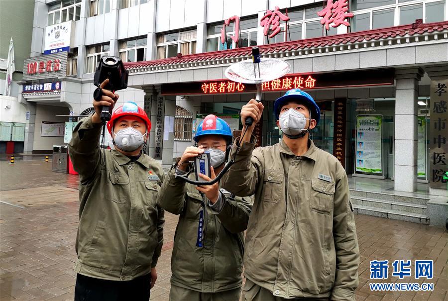 國網(wǎng)湖北孝感供電公司開發(fā)區(qū)供電中心配電運(yùn)檢班班長沈剛(左一)用紅外成像儀檢查醫(yī)院專用供電線路(1月24日攝)。 新華社發(fā) (劉剛 攝)