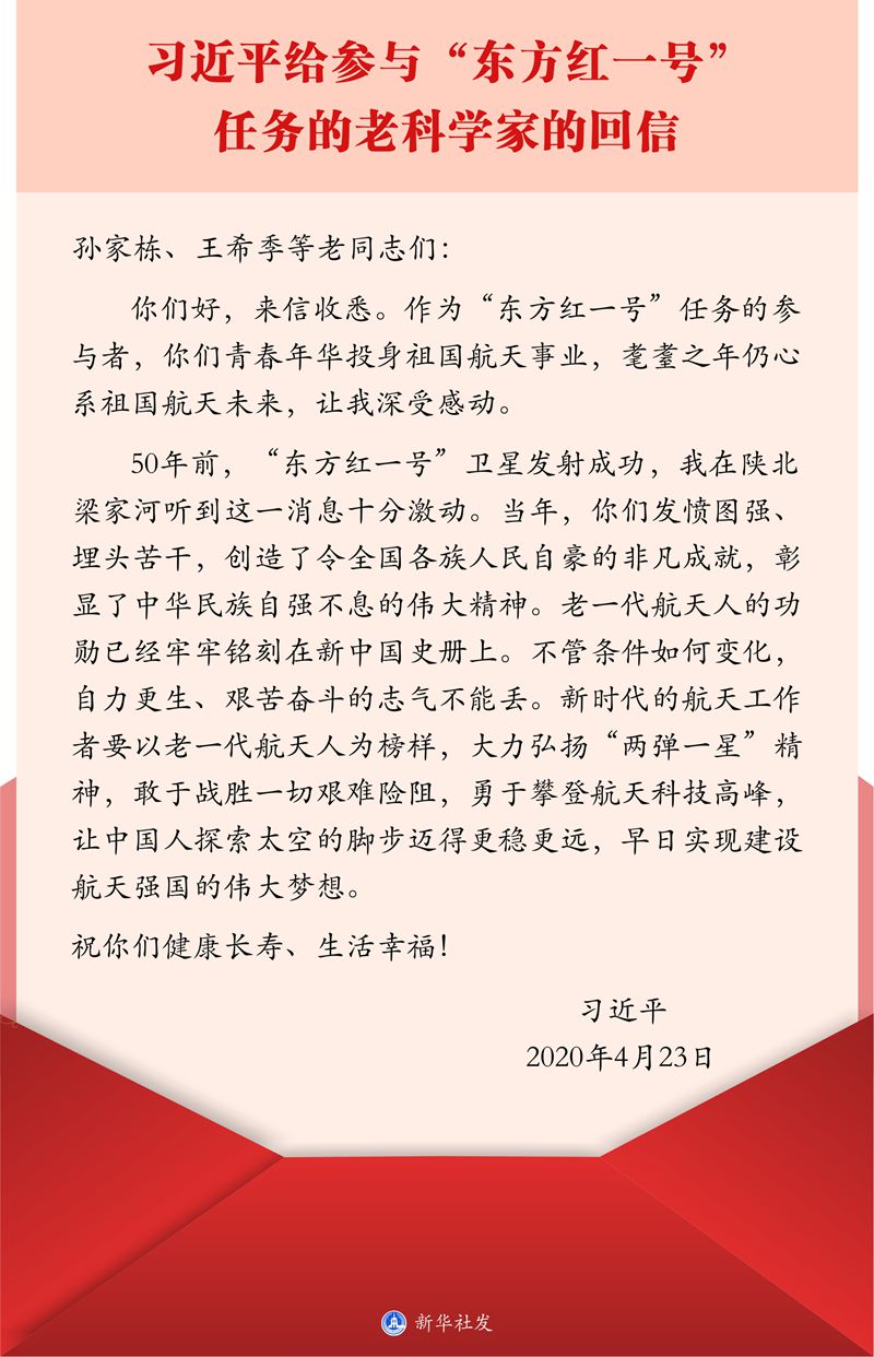 50年前,“東方紅一號”衛(wèi)星發(fā)射成功,我在陜北梁家河聽到這一消息十分激動。當年,你們發(fā)憤圖強、埋頭苦干,創(chuàng)造了令全國各族人民自豪的非凡成就,彰顯了中華民族自強不息的偉大精神。老一代航天人的功勛已經(jīng)牢牢銘刻在新中國史冊上。不管條件如何變化,自力更生、艱苦奮斗的志氣不能丟。新時代的航天工作者要以老一代航天人為榜樣,大力弘揚“兩彈一星”精神,敢于戰(zhàn)勝一切艱難險阻,勇于攀登航天科技高峰,讓中國人探索太空的腳步邁得更穩(wěn)更遠,早日實現(xiàn)建設(shè)航天強國的偉大夢想。