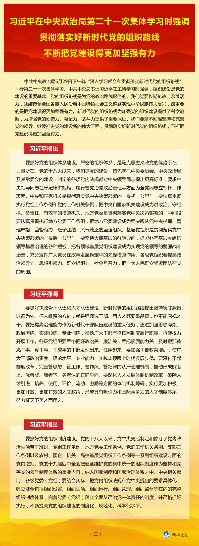 新華社北京6月30日電 中共中央政治局6月29日下午就“深入學(xué)習(xí)領(lǐng)會(huì)和貫徹落實(shí)新時(shí)代黨的組織路線”舉行第二十一次集體學(xué)習(xí)。中共中央總書記習(xí)近平在主持學(xué)習(xí)時(shí)強(qiáng)調(diào),組織建設(shè)是黨的建設(shè)的重要基礎(chǔ)。黨的組織路線是為黨的政治路線服務(wù)的。我們黨要長期執(zhí)政、永葆活力,團(tuán)結(jié)帶領(lǐng)全國各族人民沿著中國特色社會(huì)主義道路實(shí)現(xiàn)中華民族偉大復(fù)興,最重要的是把黨建設(shè)得更加堅(jiān)強(qiáng)有力。新時(shí)代黨的組織路線為加強(qiáng)黨的組織建設(shè)提供了科學(xué)遵循,為增強(qiáng)黨的創(chuàng)造力、凝聚力、戰(zhàn)斗力提供了重要保證。我們要毫不動(dòng)搖堅(jiān)持和完善黨的領(lǐng)導(dǎo)、繼續(xù)推進(jìn)黨的建設(shè)新的偉大工程,貫徹落實(shí)好新時(shí)代黨的組織路線,不斷把黨建設(shè)得更加堅(jiān)強(qiáng)有力。