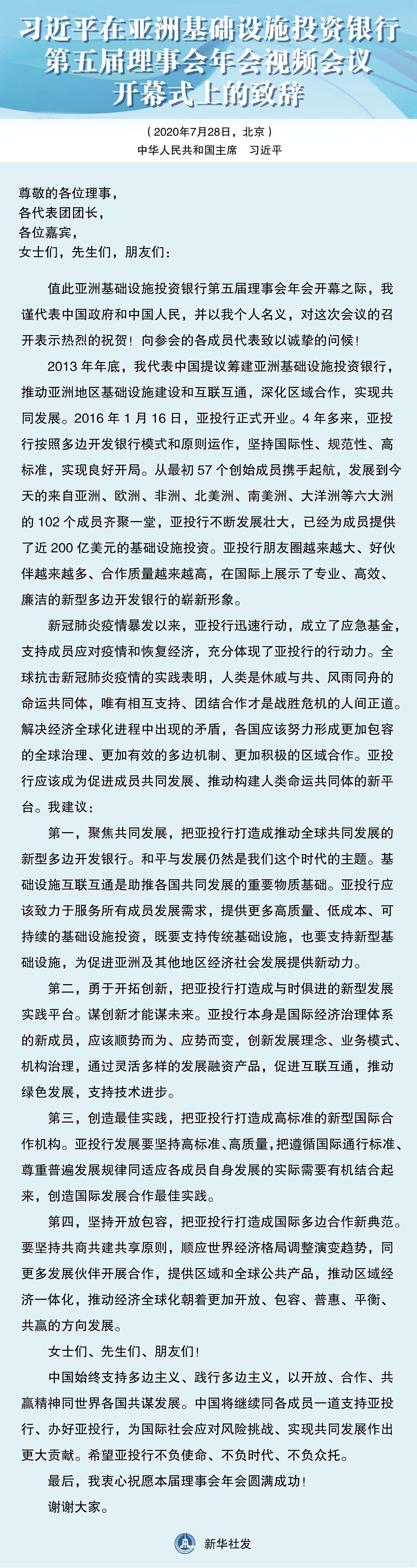 在亞洲基礎(chǔ)設(shè)施投資銀行第五屆理事會(huì)年會(huì)視頻會(huì)議開(kāi)幕式上的致辭
