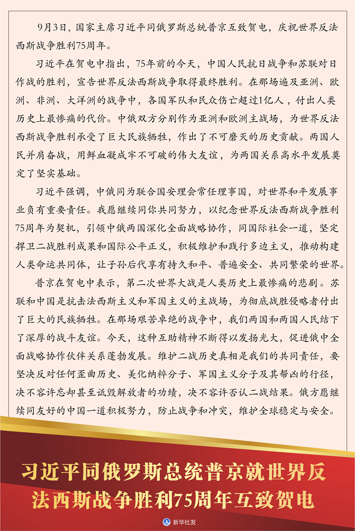 習(xí)近平在賀電中指出,75年前的今天,中國人民抗日戰(zhàn)爭和蘇聯(lián)對日作戰(zhàn)的勝利,宣告世界反法西斯戰(zhàn)爭取得最終勝利。在那場遍及亞洲、歐洲、非洲、大洋洲的戰(zhàn)爭中,各國軍隊和民眾傷亡超過1億人,付出人類歷史上最慘痛的代價。中俄雙方分別作為亞洲和歐洲主戰(zhàn)場,為世界反法西斯戰(zhàn)爭勝利承受了巨大民族犧牲,作出了不可磨滅的歷史貢獻。兩國人民并肩奮戰(zhàn),用鮮血凝成牢不可破的偉大友誼,為兩國關(guān)系高水平發(fā)展奠定了堅實基礎(chǔ)。