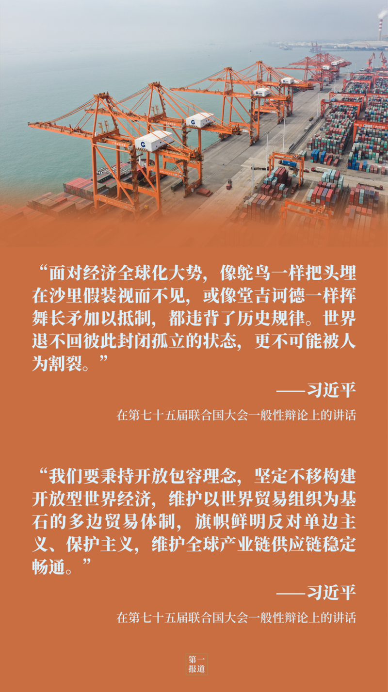 在聯(lián)合國“云講臺”,習(xí)主席還向國際社會生動闡釋了中國“新發(fā)展格局”與構(gòu)建開放型世界經(jīng)濟、推動全球經(jīng)濟復(fù)蘇的關(guān)系:“我們不追求一枝獨秀,不搞你輸我贏,也不會關(guān)起門來封閉運行,將逐步形成以國內(nèi)大循環(huán)為主體、國內(nèi)國際雙循環(huán)相互促進的新發(fā)展格局,為中國經(jīng)濟發(fā)展開辟空間,為世界經(jīng)濟復(fù)蘇和增長增添動力?!?/p>