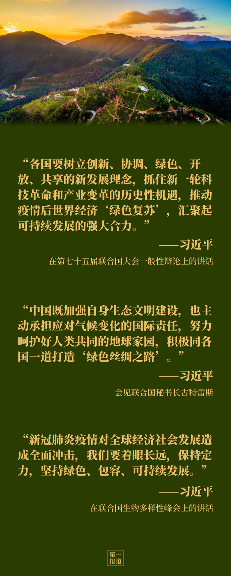 “創(chuàng)新、協(xié)調(diào)、綠色、開放、共享的新發(fā)展理念”“綠色復(fù)蘇”“綠色絲綢之路”……梳理習(xí)主席出席聯(lián)合國成立75周年系列高級別會議期間一系列重要論述,“綠色”是出現(xiàn)頻率最高的關(guān)鍵詞之一。