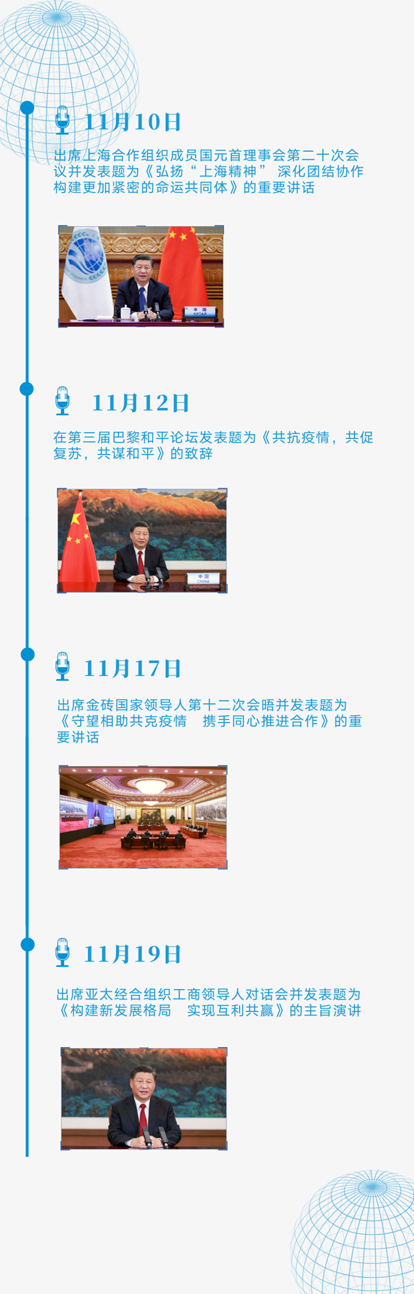 11月10日至22日,不到兩周時(shí)間,習(xí)主席以視頻方式出席4場(chǎng)多邊會(huì)議、一場(chǎng)國(guó)際論壇,發(fā)表8場(chǎng)重要講話、主旨演講和致辭,外交日程異常密集。