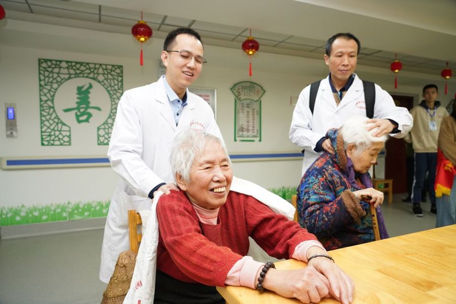 三明市盲協主席江華帶領盲人志愿團隊為社區(qū)老人按摩推拿。周志鴻 攝