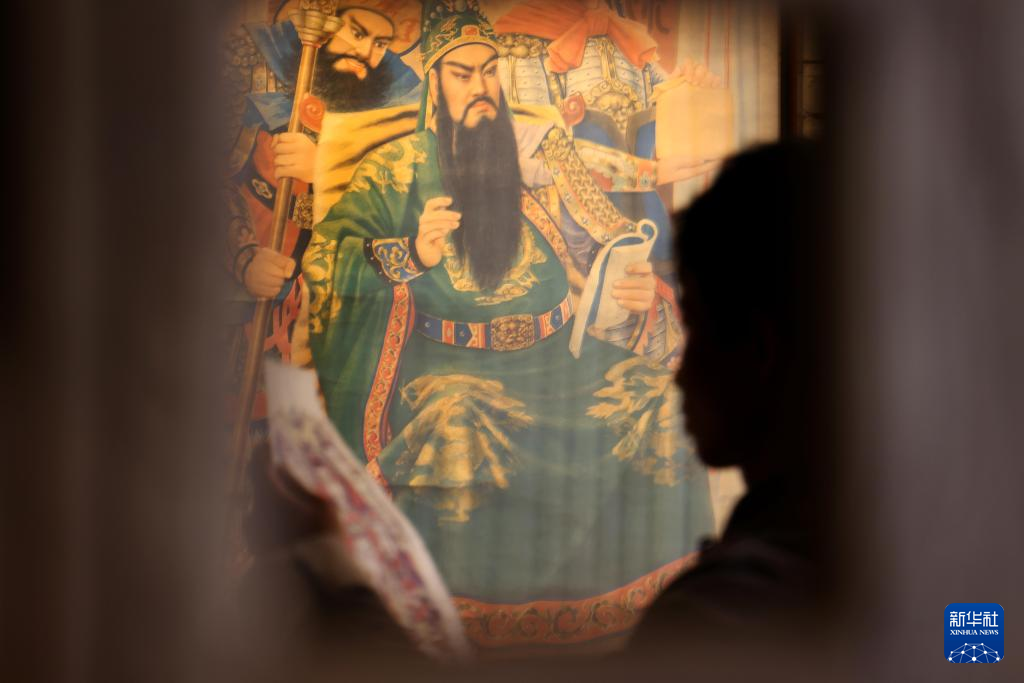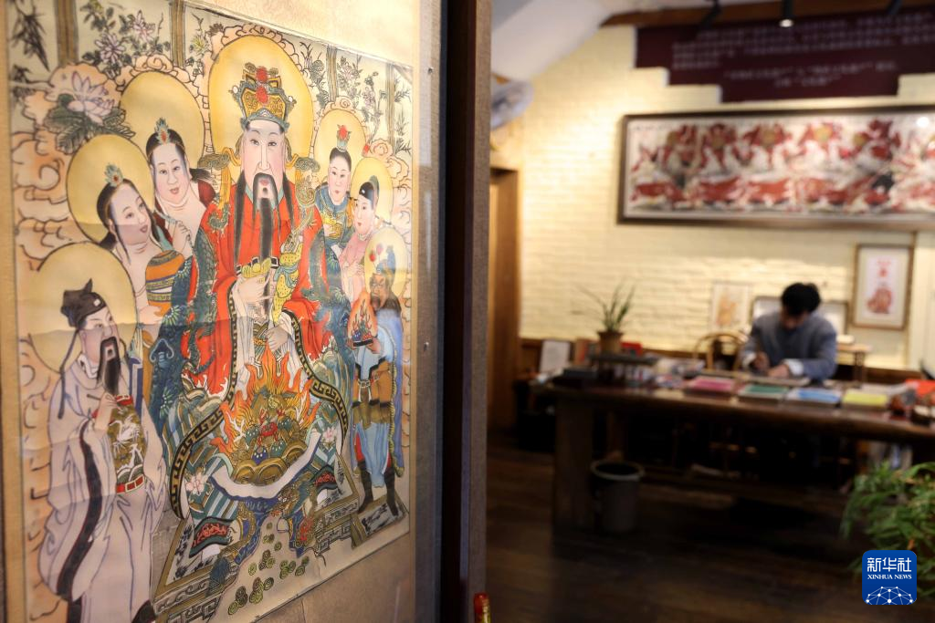 2月10日,在童寿记木版年画工作室,童敏在研究年画创作工艺。