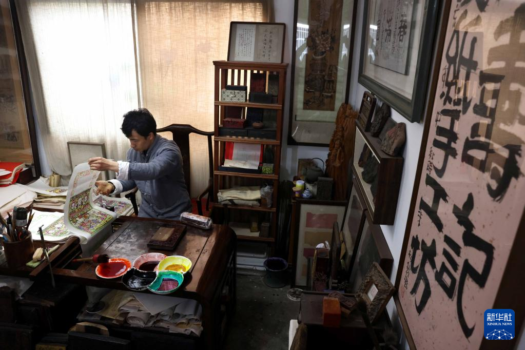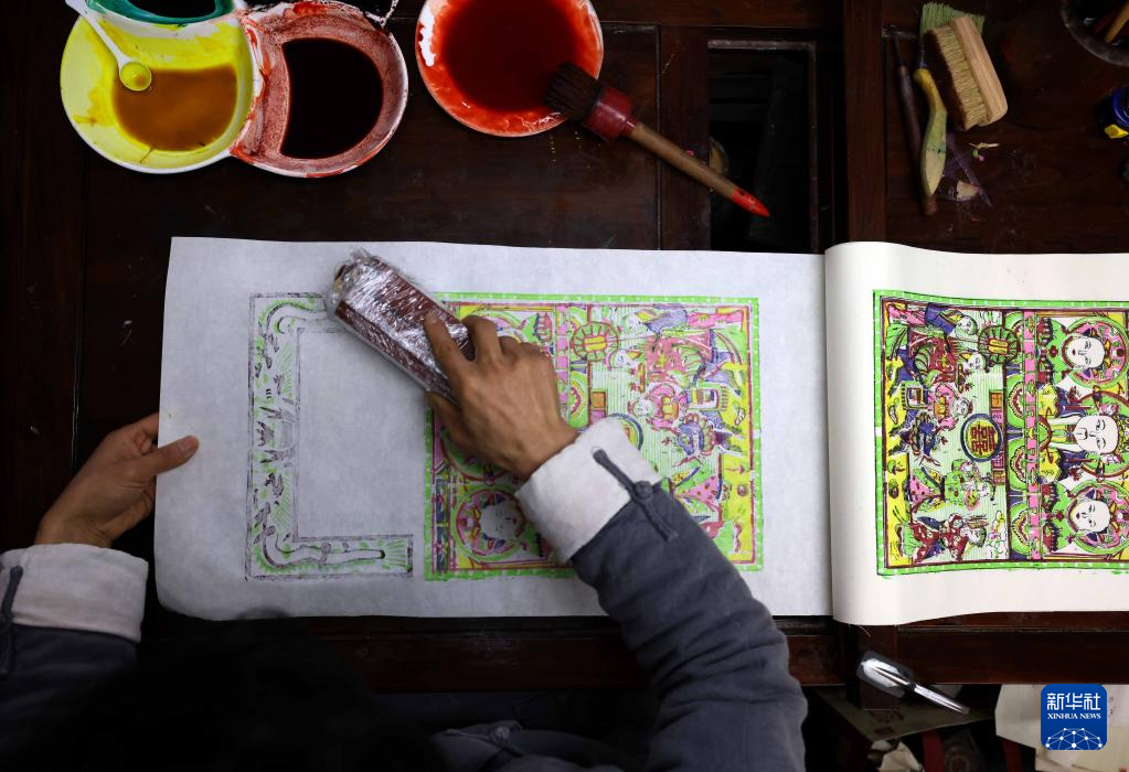 2月10日,在童寿记木版年画工作室,童敏在印制年画。