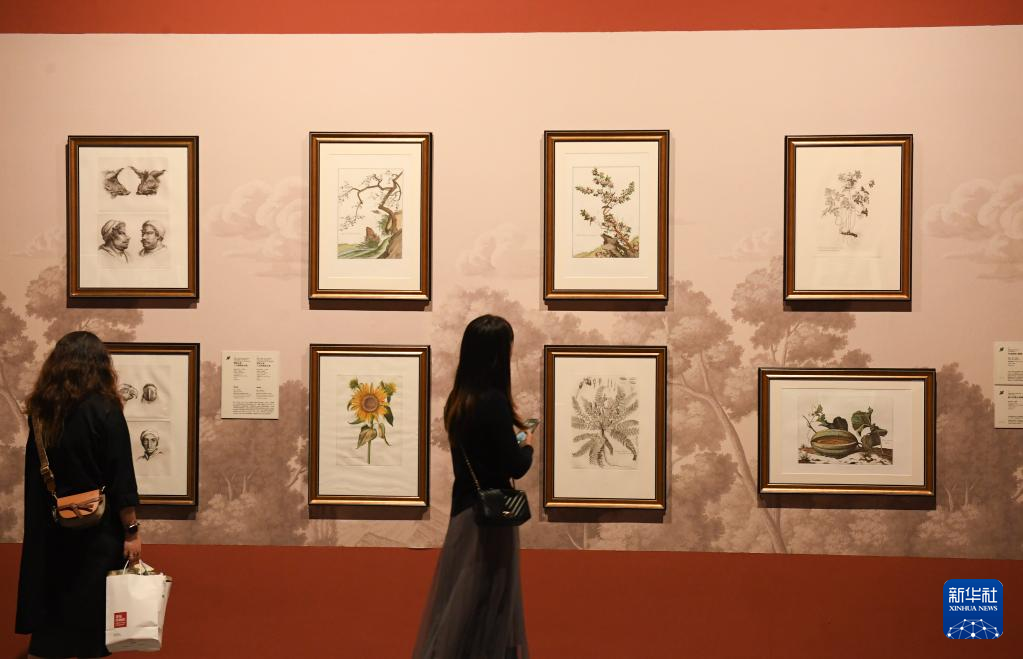 4月14日,工作人员向观众介绍路易十四肖像(左)和依据此画创作的19世纪蚀刻版画作品(右)。