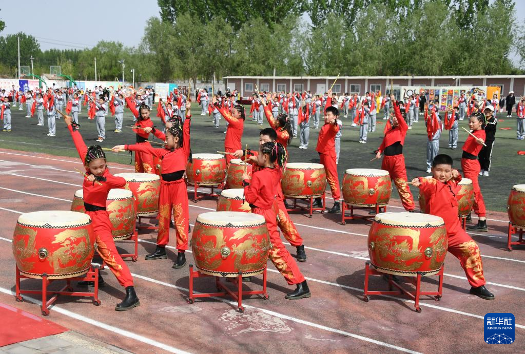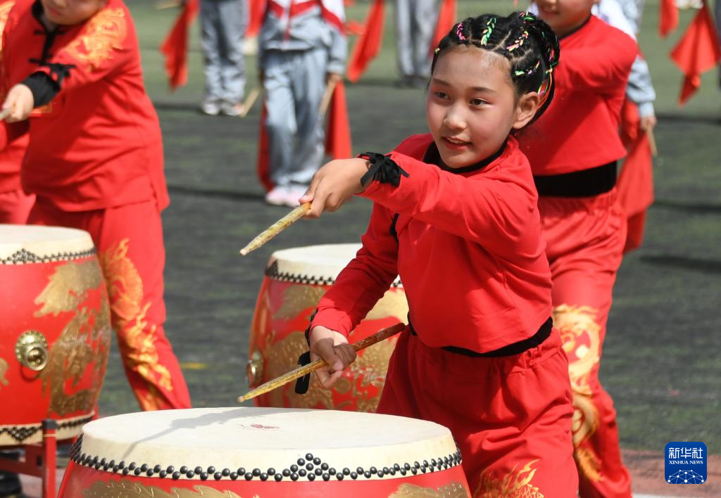 4月19日,门楼中心小学的学生在活动中进行鼓舞表演。