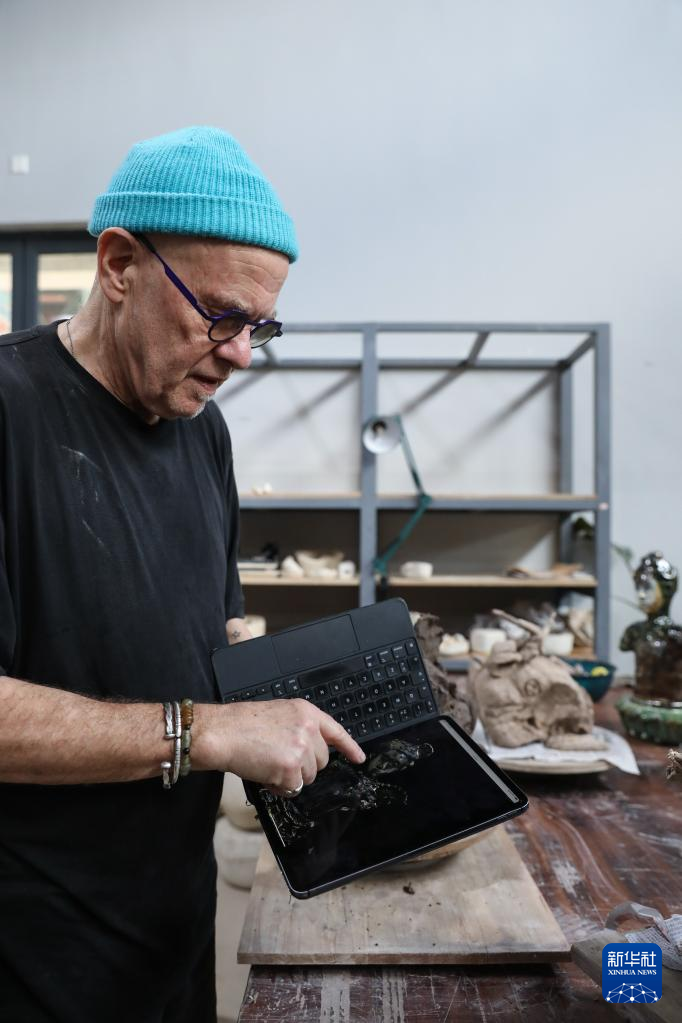 托尔斯滕·尤雷尔在江西景德镇陶溪川陶瓷文化创意园自己的工作室内介绍作品(4月20日摄)。