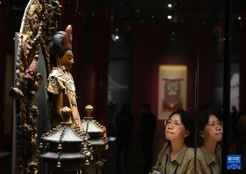 4月28日,嘉宾在北京故宫博物院参观梵华楼铜鎏金般若品佛像。
