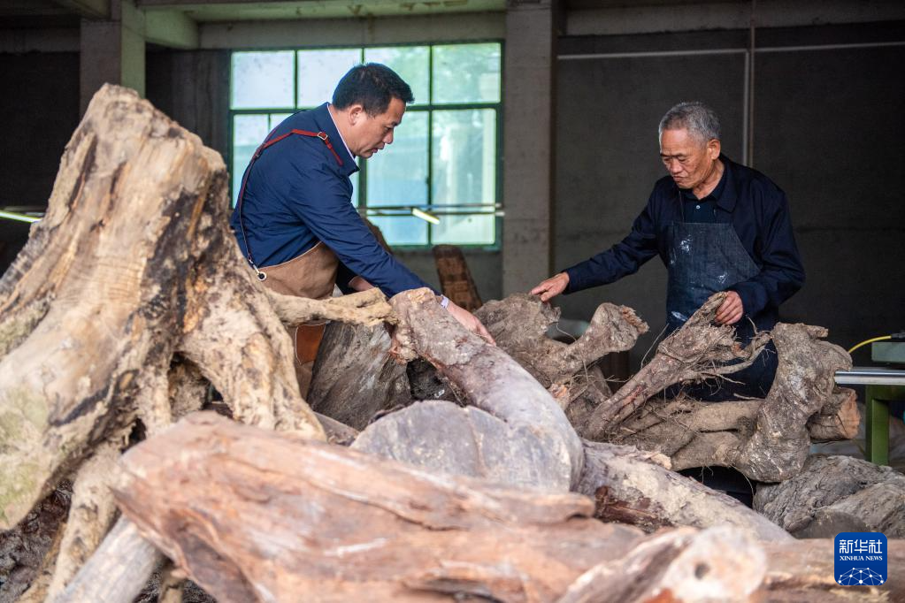 5月23日,在洞口县岩山镇阳家山村,傅立先(左)和父亲傅金林在挑选木雕材料。