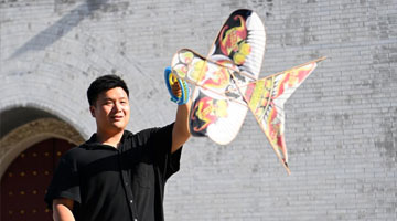 在天津市鼓楼附近,魏博文在放飞一架制作完成的风筝(6月8日摄)。