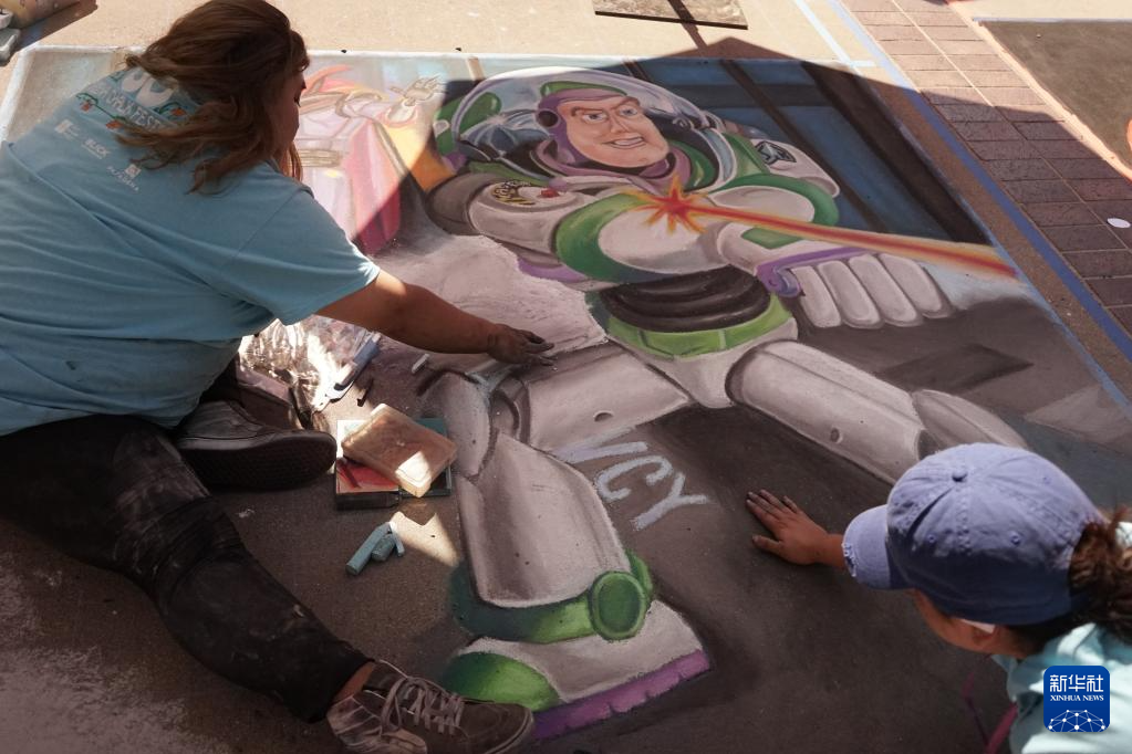 6月18日,艺术工作者在美国加利福尼亚州帕萨迪纳市举行的粉笔画节上创作。