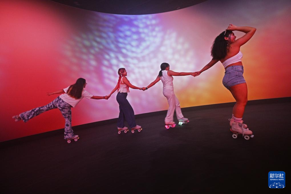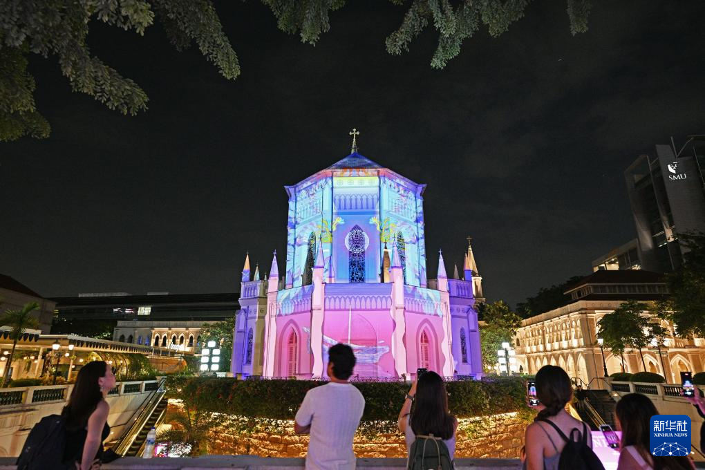 8月16日,观众在新加坡举行的“新加坡仲夏夜空”艺术活动预展上欣赏灯光投影秀。