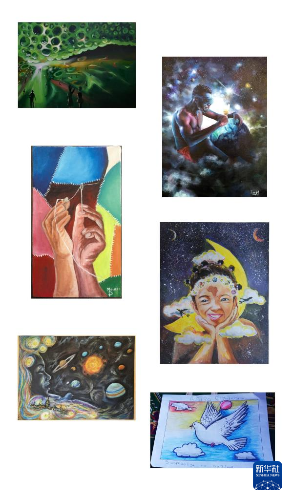 这张拼版照片显示的是非洲青少年“我的梦想”主题绘画作品大赛一等奖“天和”奖的部分作品。