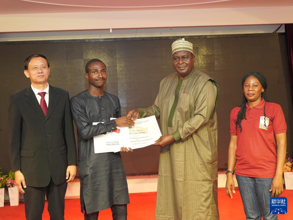 5月31日,在尼日利亚阿布贾中国文化中心,尼日利亚青年达尼亚(左二)在当天举行的颁奖仪式上接过绘画作品获奖证书。