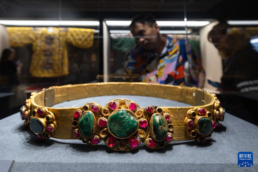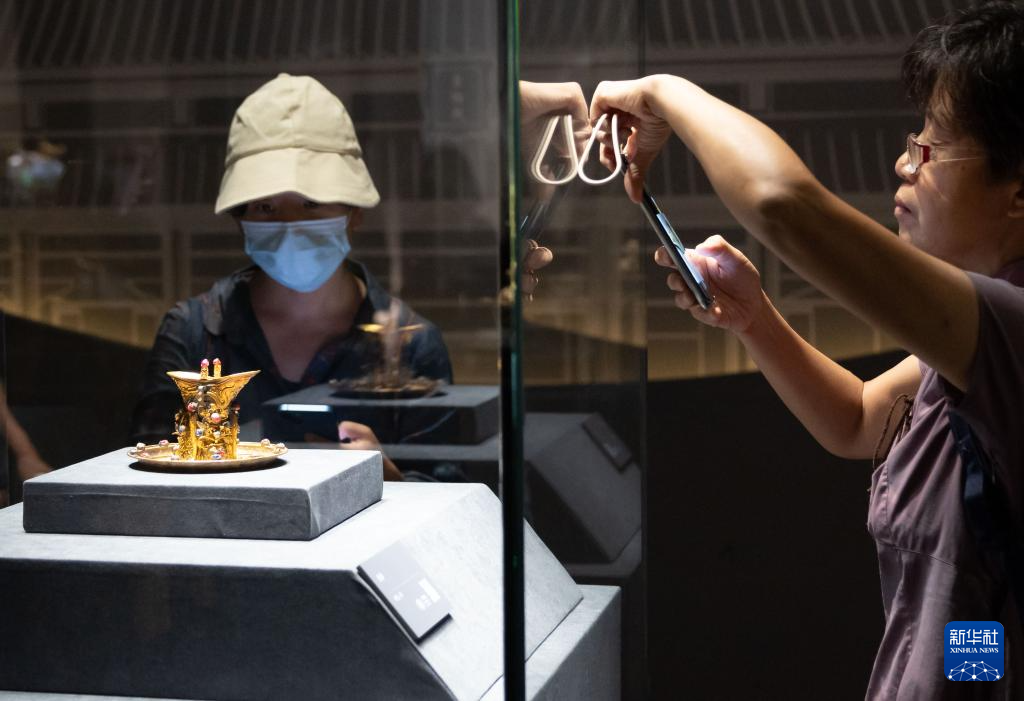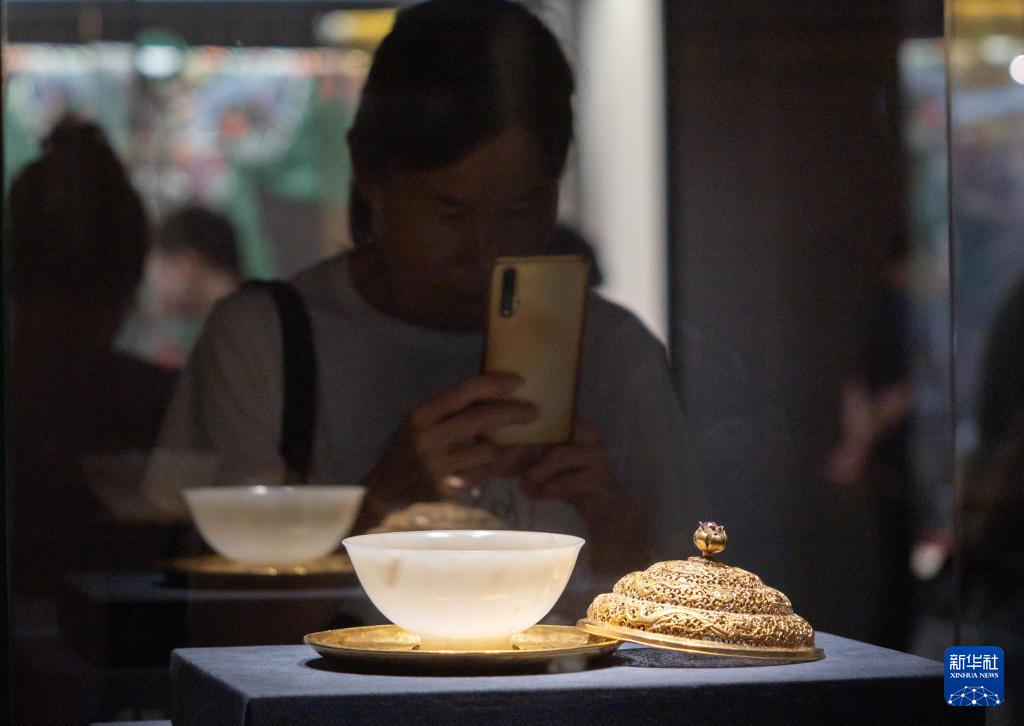 9月15日,观众在展览上拍摄镂空金盖金托盘玉碗。