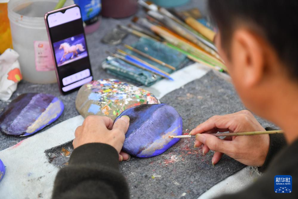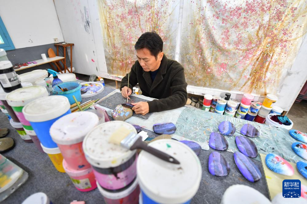 11月8日,在湖南省浏阳市小河乡乌石村,农民在画室绘制石头画。
