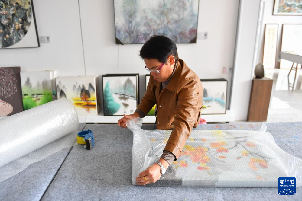 11月8日,在湖南省浏阳市小河乡乌石村的乌石当代艺术馆,农民对绘制好的油画进行初步包装。