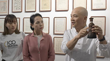 11月9日,在开化纸传统技艺工坊,黄宏健(中)和妻子赖丽芳(左)向来访者展示各类纸品。