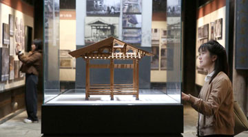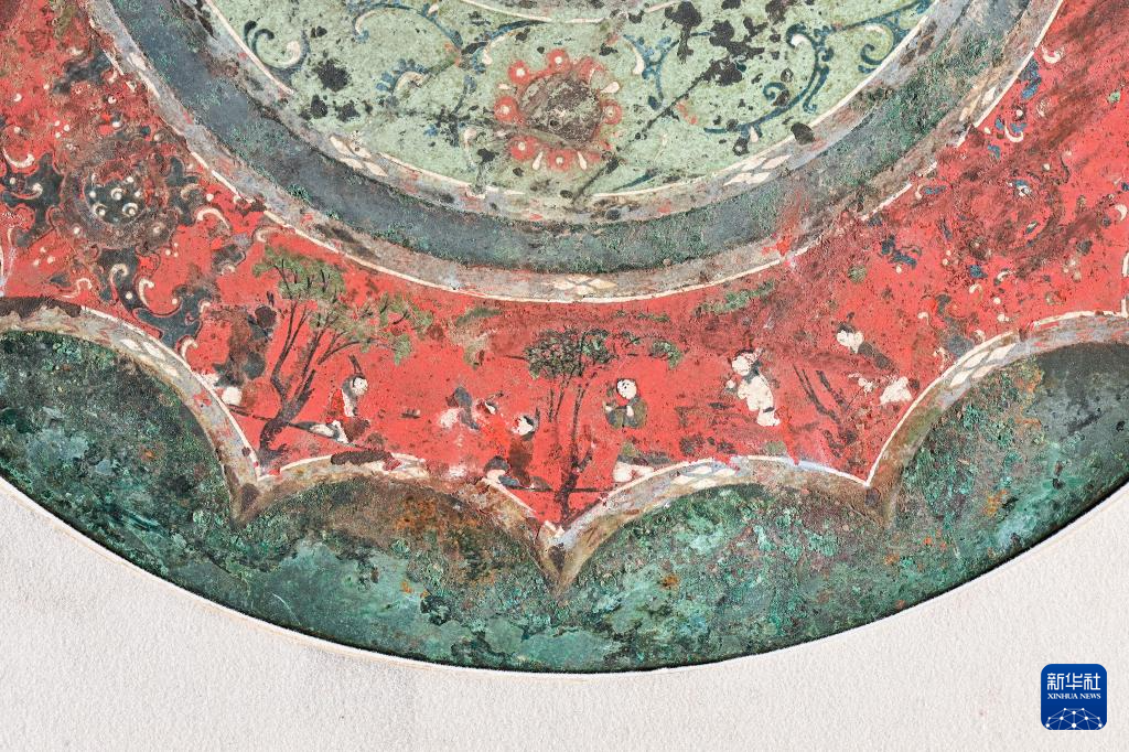 西汉彩绘人物车马镜局部彩绘图案“宴饮”(8月25日摄)。