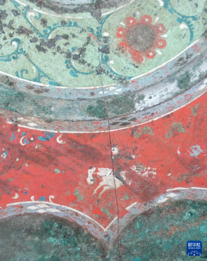 西汉彩绘人物车马镜局部彩绘图案(8月25日摄)。