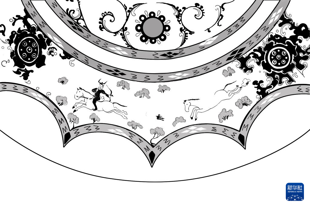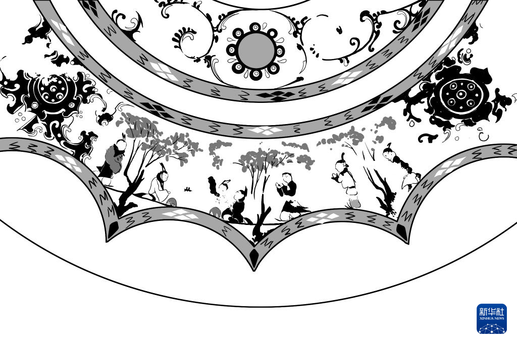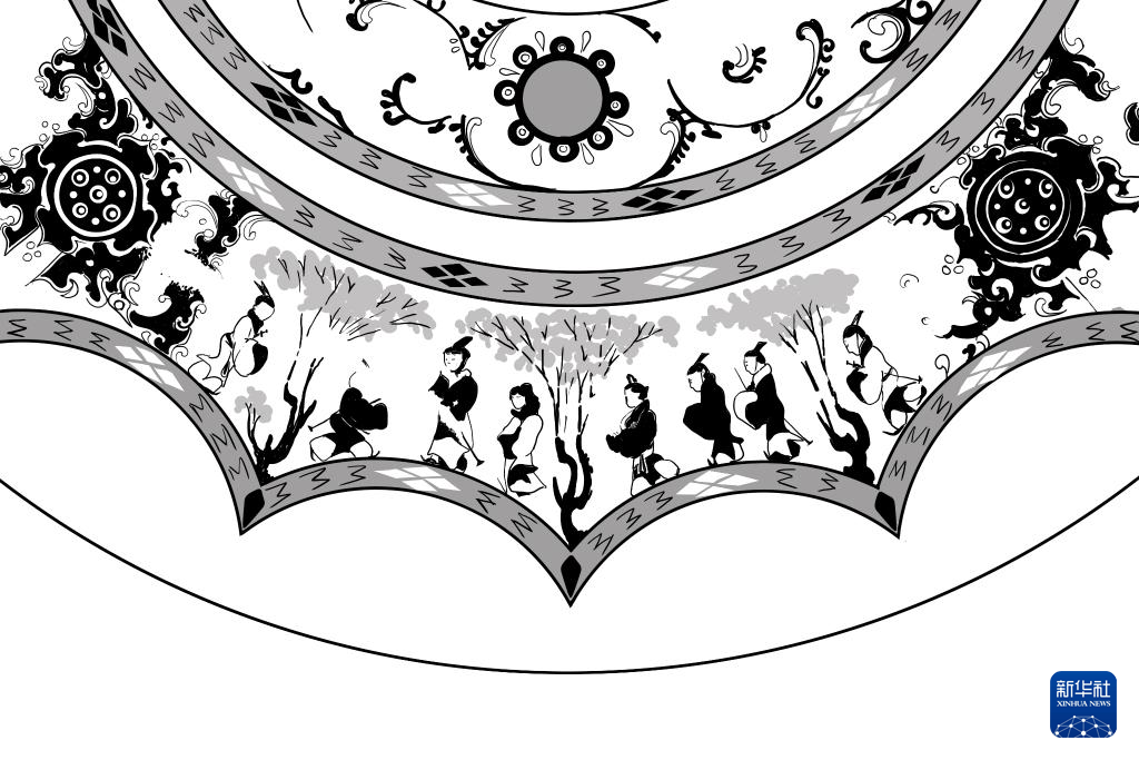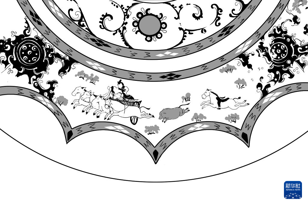 外区:红色地彩上被四个圆形纹饰分成四区,每个区隔内都绘有若干人物,展现贵族生活场景。经专家研读,四个区域按顺序可确定为出行、谒见、狩猎、宴饮四个题材。