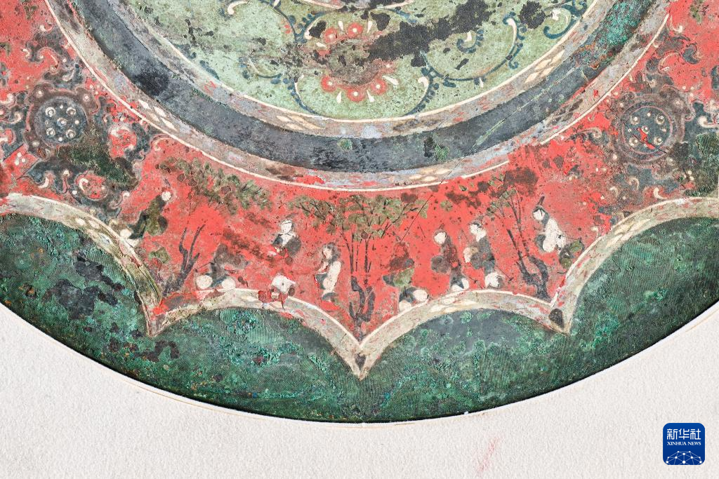 铜镜上共绘制17个人物图案,其间穿插绘制树木、草地、野兽等形象,使得四幅画面具有连贯的故事性。难能可贵的是,画面形象均以彩绘形式保留下来,非常罕见。这得益于古代画匠采用了不易氧化的矿物质颜料,朱红、石青、石绿配以黑、白等色彩的调和,使得整体画面显现出丰富多彩又不失协调的效果。