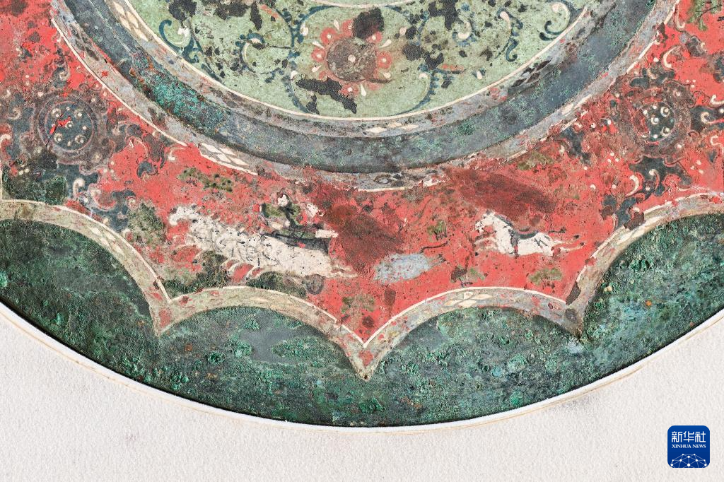 西汉彩绘人物车马镜局部彩绘图案“狩猎”(8月25日摄)。