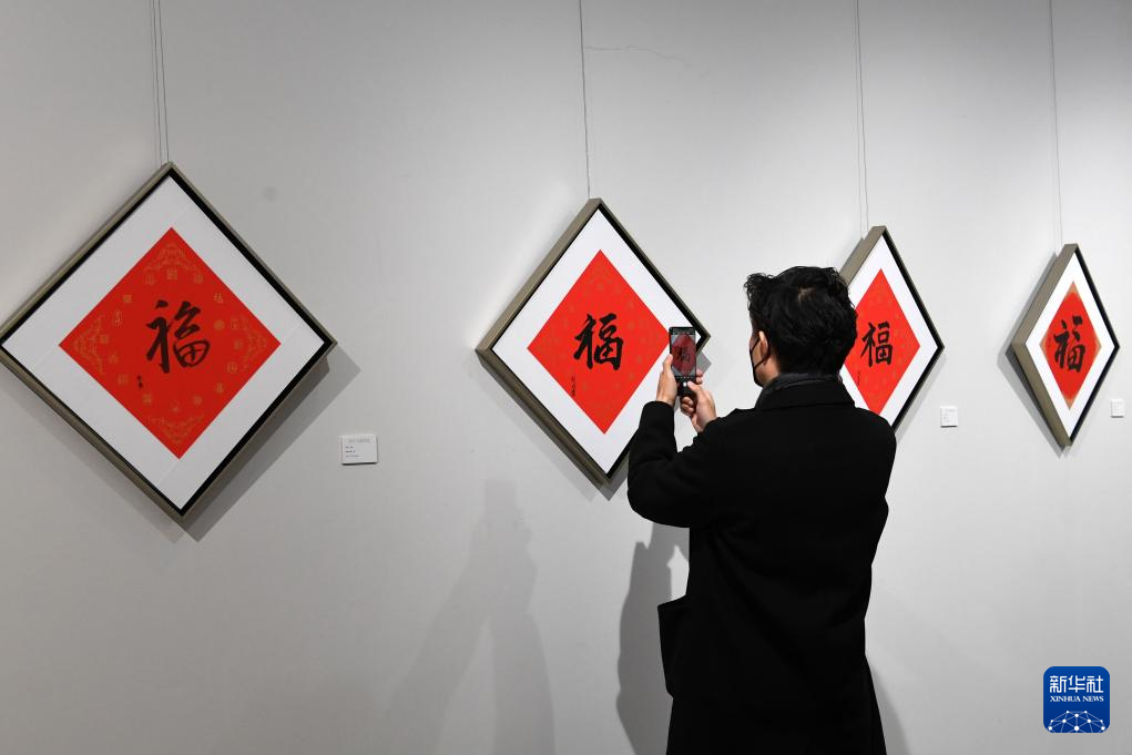 11月26日,参观者在展览现场欣赏春联和福字展品。