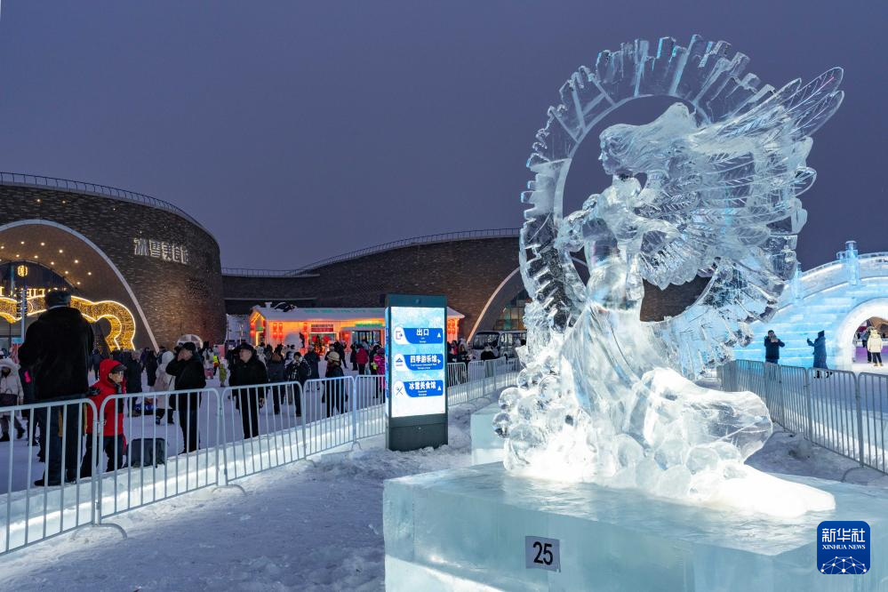 1月4日,在哈尔滨冰雪大世界园区内,游客观赏中国选手参赛冰雕作品《天使的爱》。