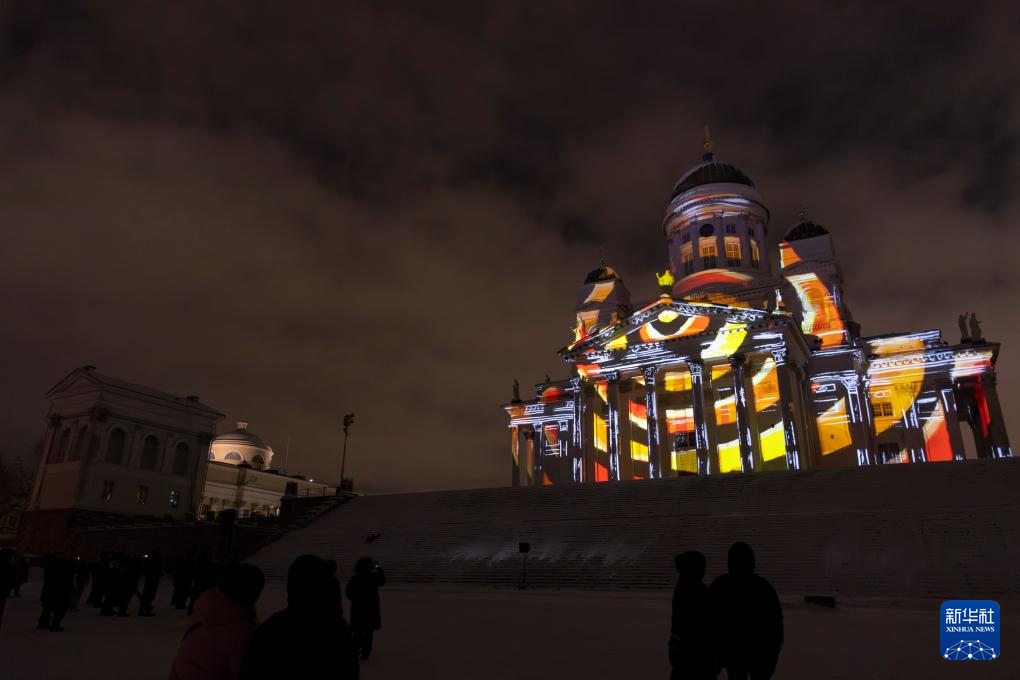 这是1月3日在芬兰赫尔辛基拍摄的一座灯光装置。