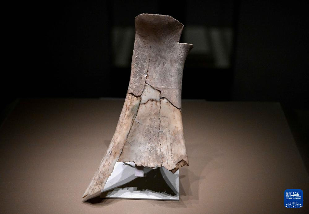 河南安阳殷墟博物馆新馆内展出的刻辞卜骨(2月26日摄)。