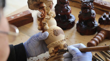 3月26日,在山东省滨州市沾化区大高镇枣木雕刻工坊内,木雕艺人崔树曾在制作木雕。