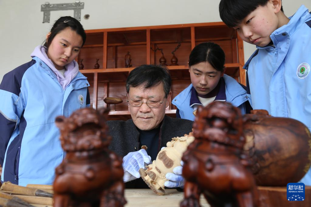 3月26日,在山东省滨州市沾化区大高镇枣木雕刻工坊内,木雕艺人崔树曾给学生们展示如何手工雕刻艺术品。