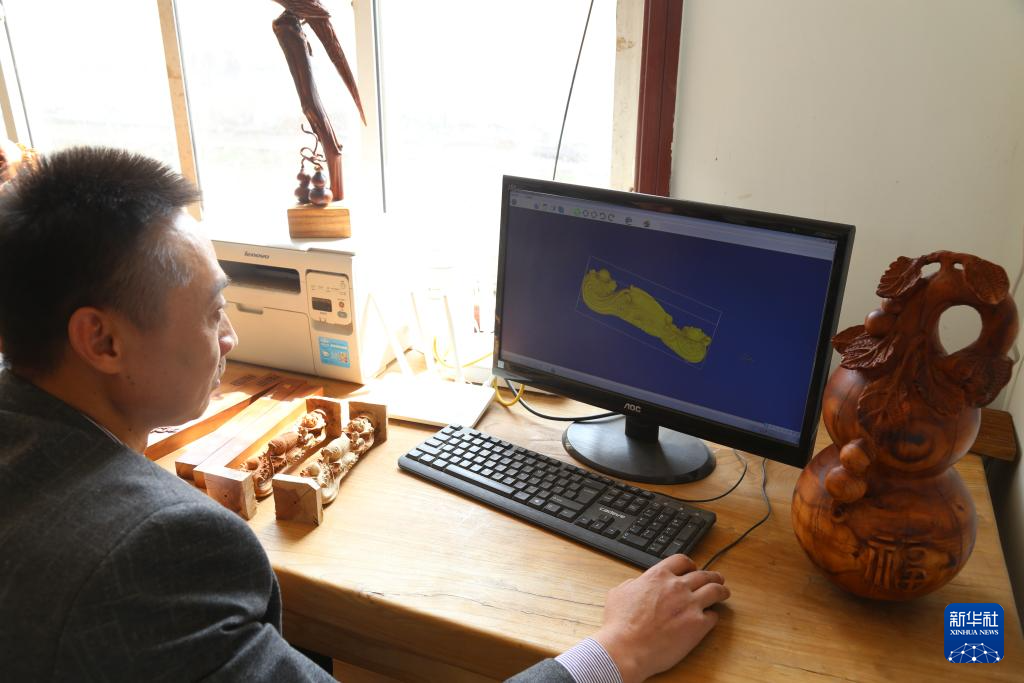 3月26日,在山东省滨州市沾化区大高镇枣木雕刻工坊内,工作人员何义青用电脑绘图。