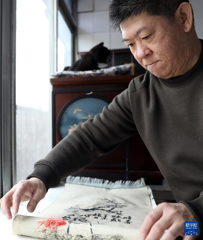 4月9日,在位于营口市的家中,申涛左手拿着缠着丝线的梭子,右手拿着梳理丝线的拨子进行缂丝作品创作。