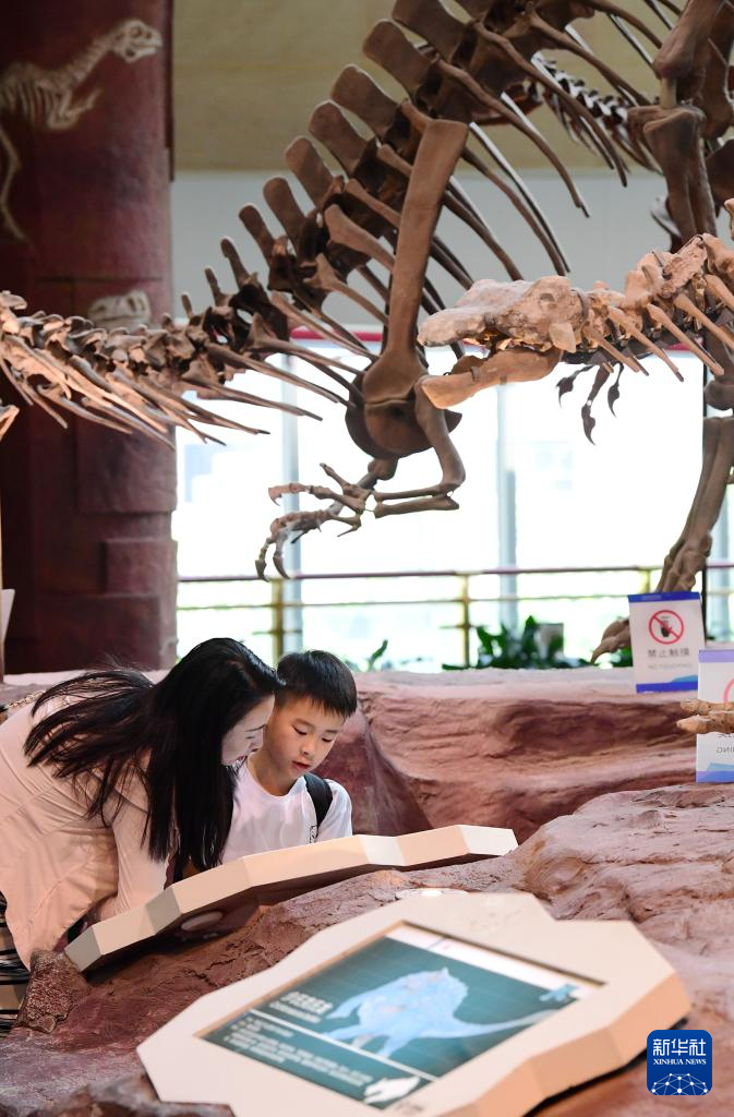 5月18日,在安徽省地质博物馆内,家长带着孩子参观恐龙化石模型。