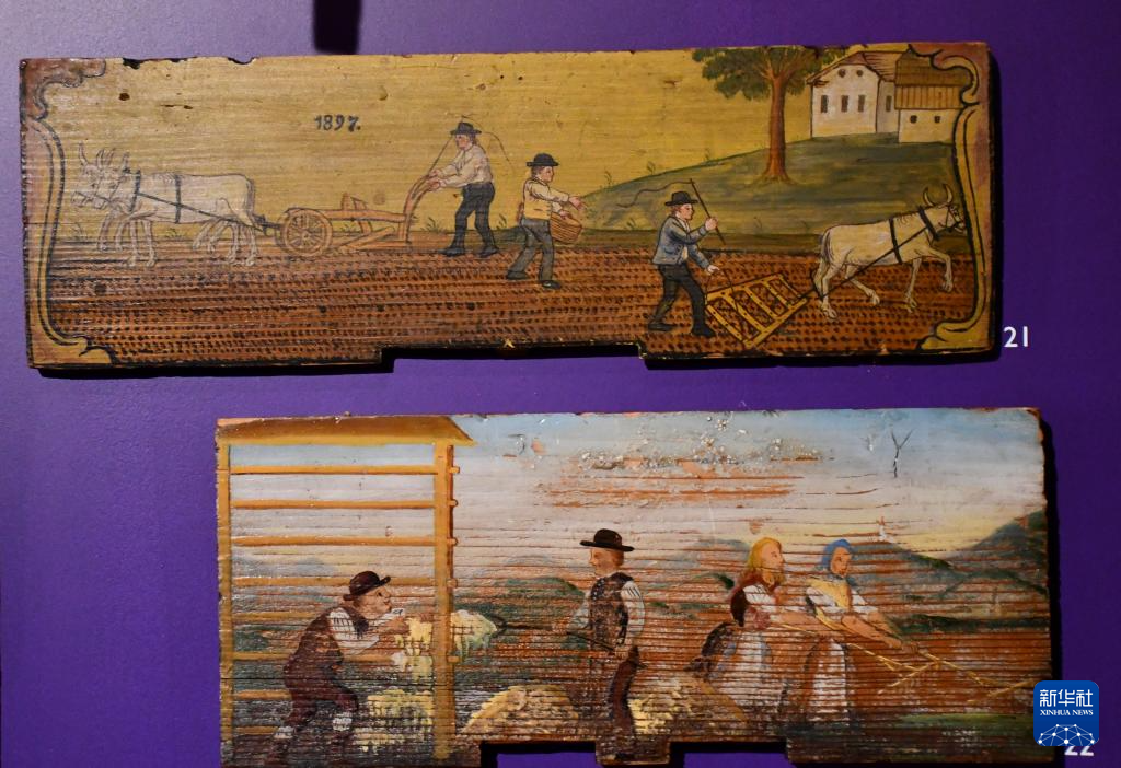 这是5月19日在斯洛文尼亚卢布尔雅那的斯洛文尼亚民族志博物馆拍摄的彩绘蜂箱面板。