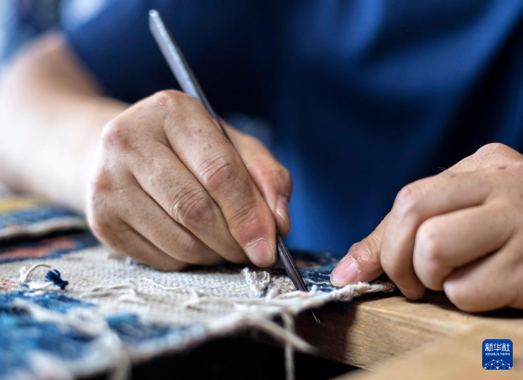 6月27日,在位于北京十里河的工作室内,冀豫展示一块宫毯的织造细节。