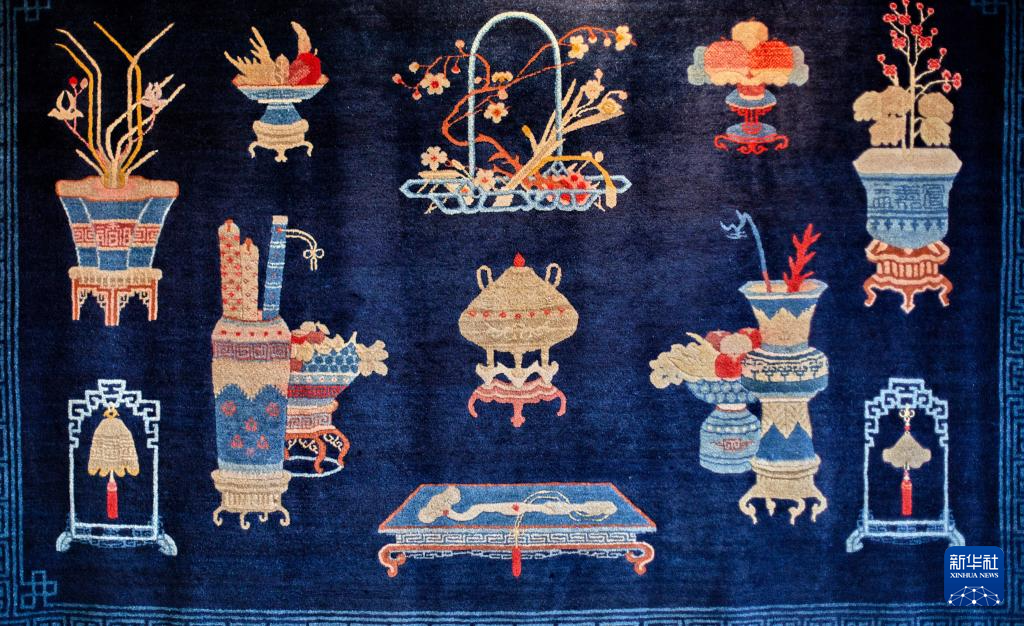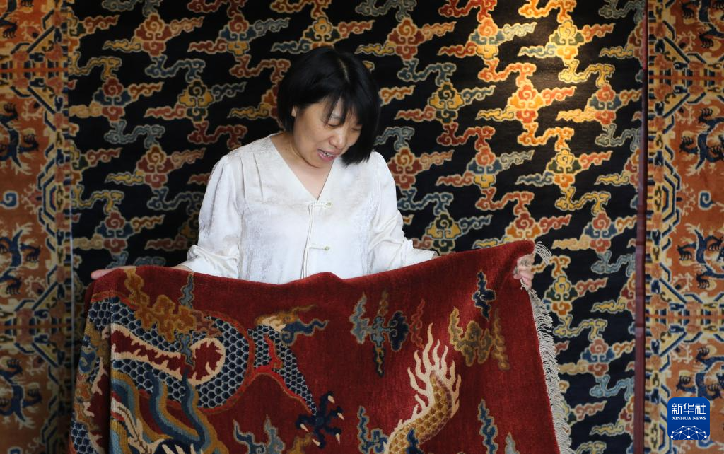 6月27日,在位于北京十里河的工作室,冀豫展示其团队的宫毯作品。