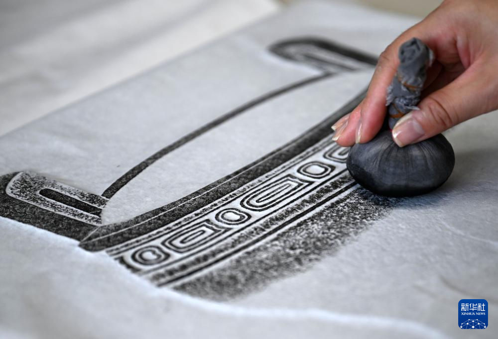 在洛阳华夏金石文化博物馆,钱夏玉将拓印完成的金石拓片揭下(9月11日摄)。