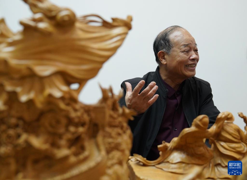 虞金顺在工作室展示自己创作的乐清黄杨木雕作品(11月25日摄)。