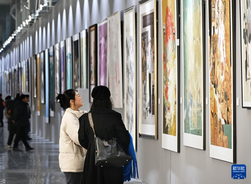 12月15日,观众从一幅动物题材的工笔画作品前经过。