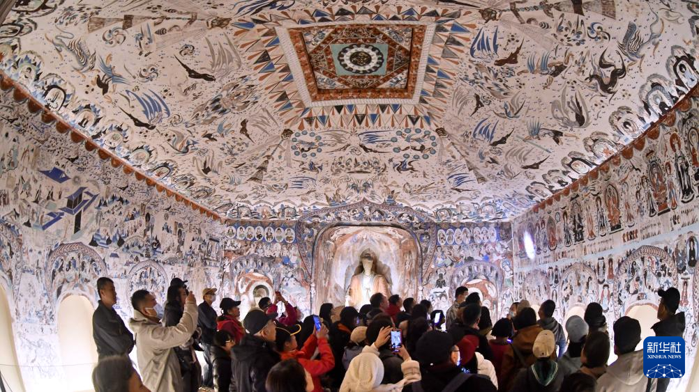 3月29日,观众在参观“如是莫高”敦煌艺术大展中展出的莫高窟第285窟的复刻版本。