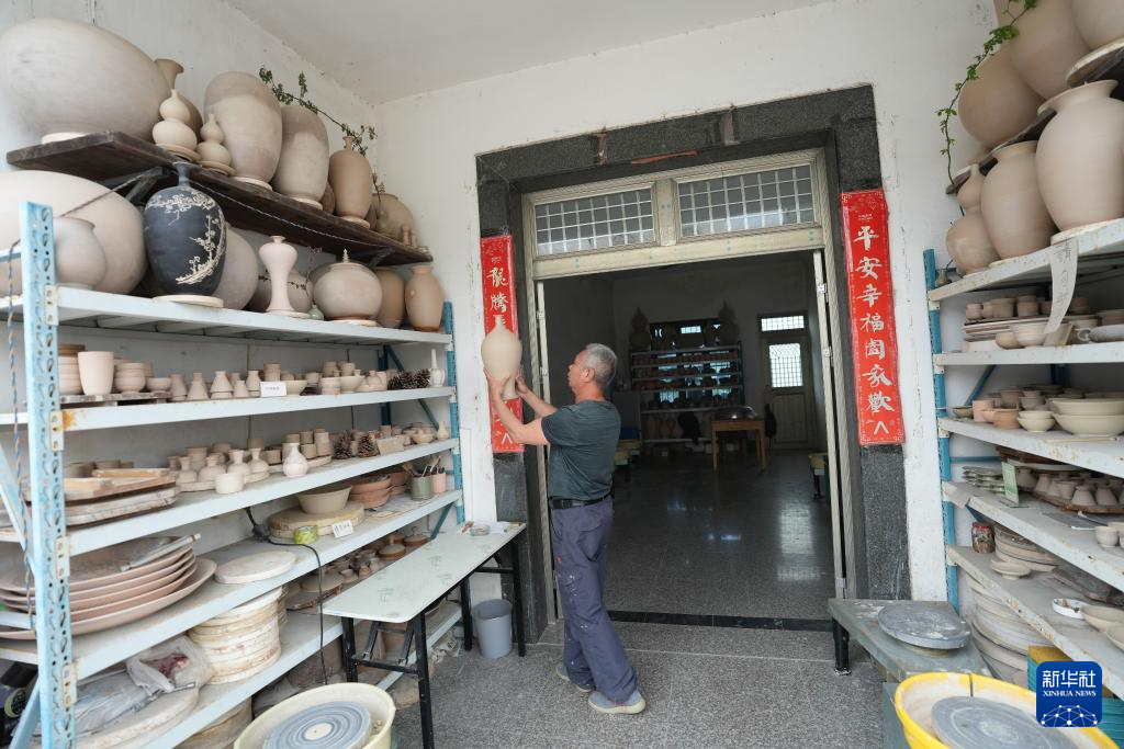 4月17日,施尚剑在位于慈溪市桥头镇的工作室摆放瓷坯。