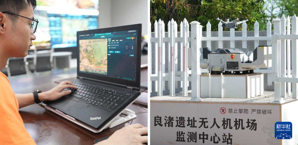 拼版照片:左图为科研人员在良渚古城遗址世界遗产检测管理中心利用数智应用远程操控无人机;右图为无人机从良渚遗址无人机机场起飞进行遗产要素定期巡查(4月18日摄)。